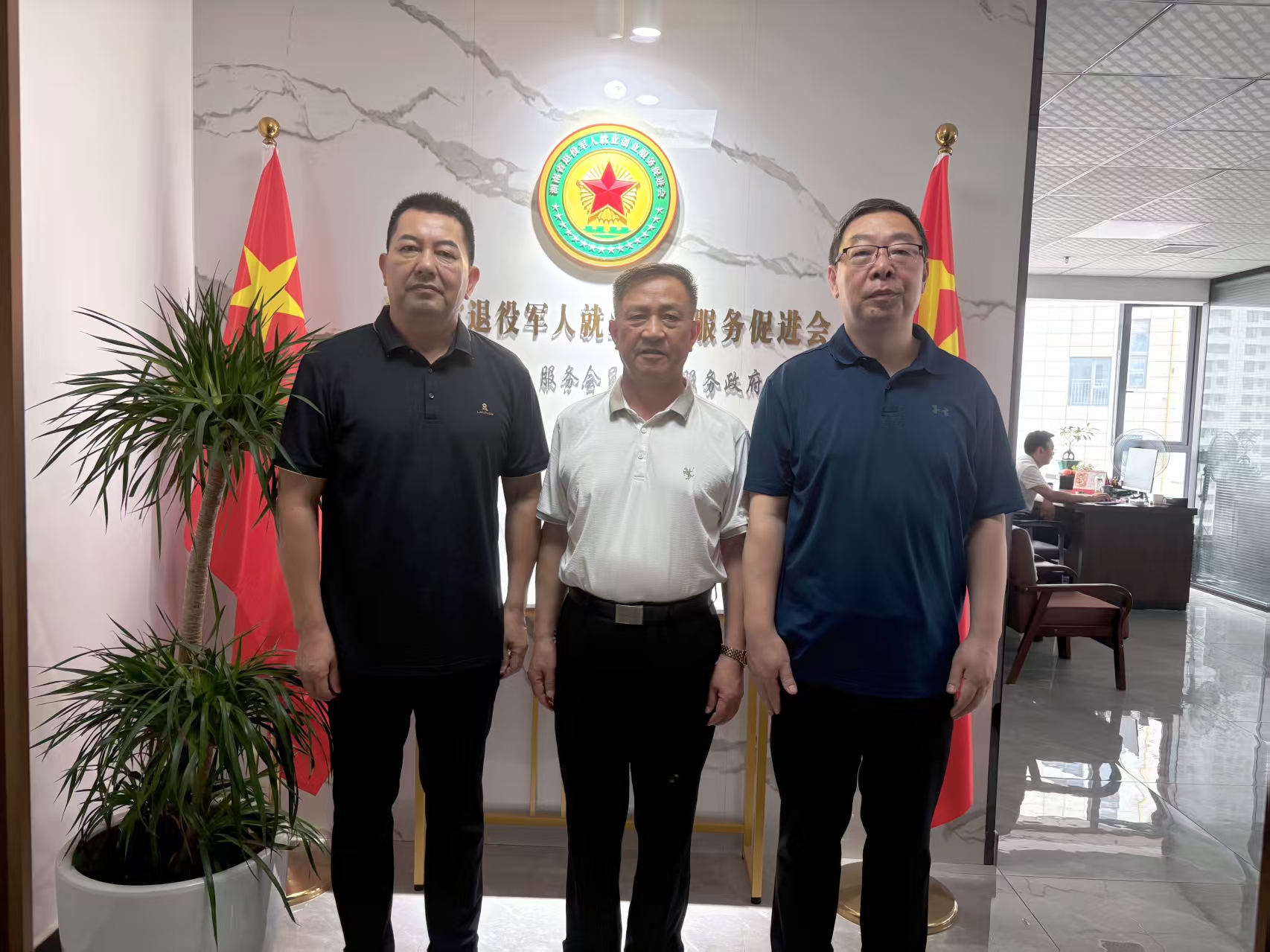 6月26日上午,受湖南省企业文化促进会执行会长、长沙市湘潭商会会长谢建军委托,长沙市湘潭商会秘书长刘迎、副会长李良培一行赴湖南省退役军人就业创业服务促进会走访交流,湖南省退役军人就业创业服务促进会党支部书记兼副理事长、衡阳警备区原副司令员杨泽定热情接待。双方围绕深化合作、资源共享等议题,共谋退役军人就业创业新发展。