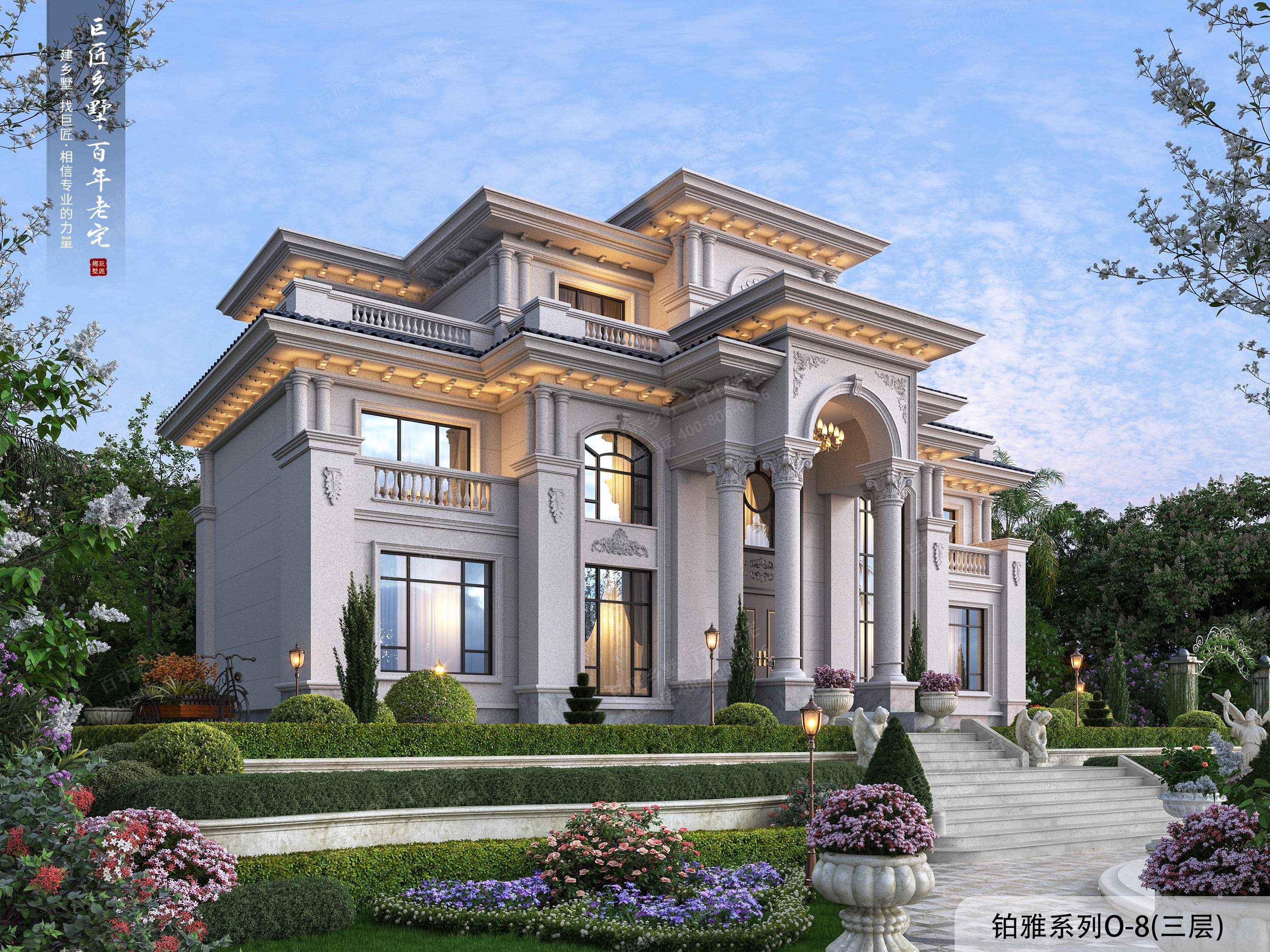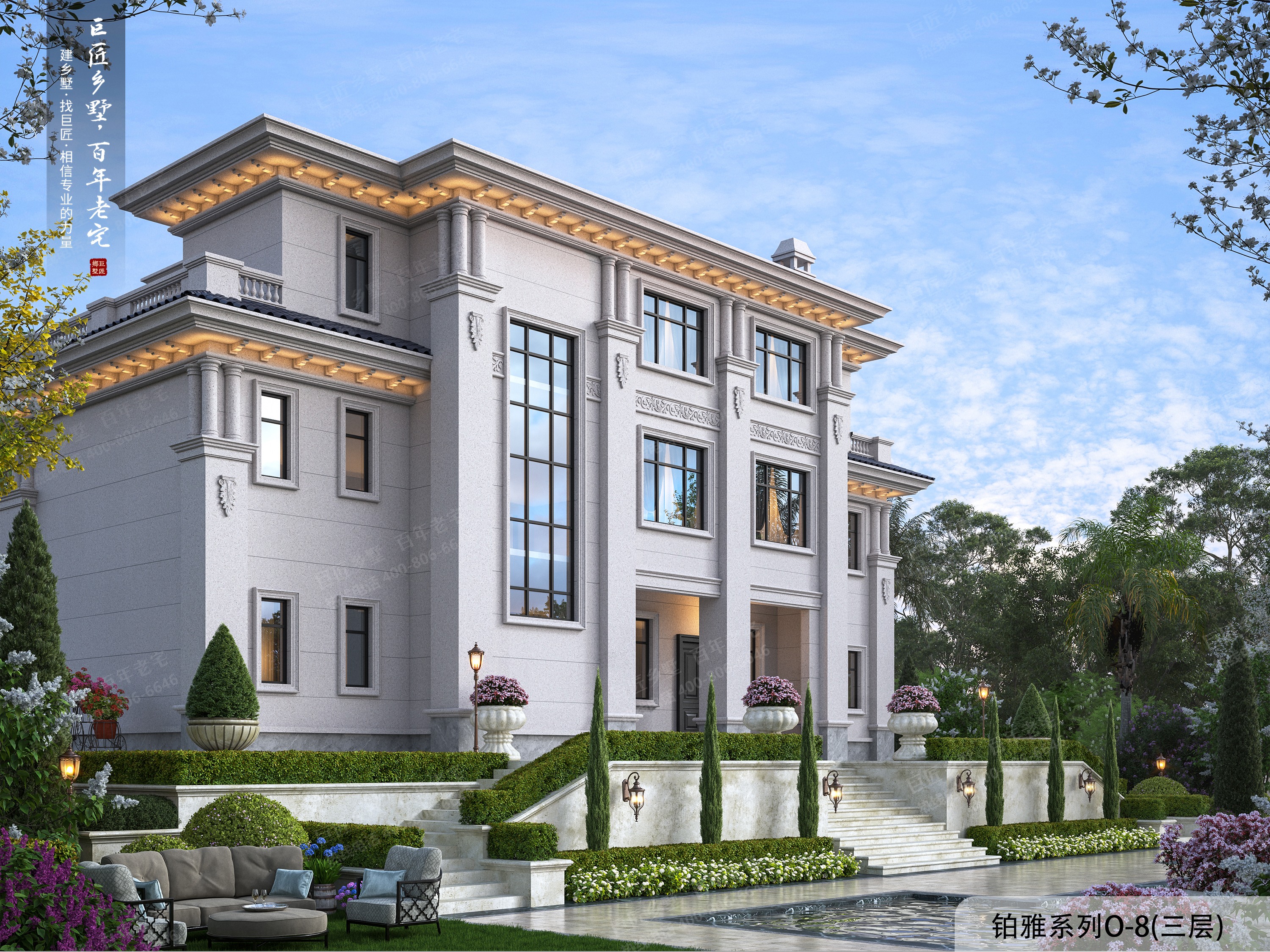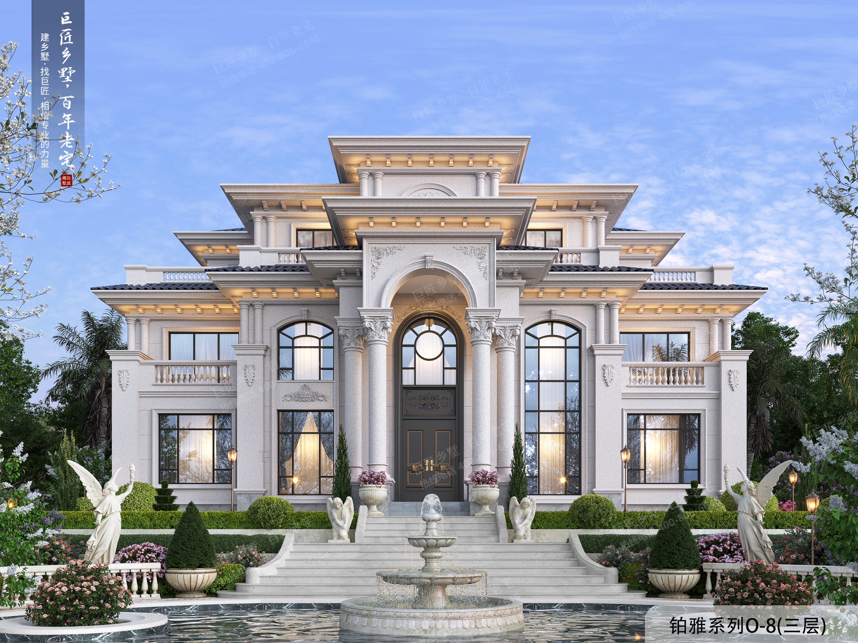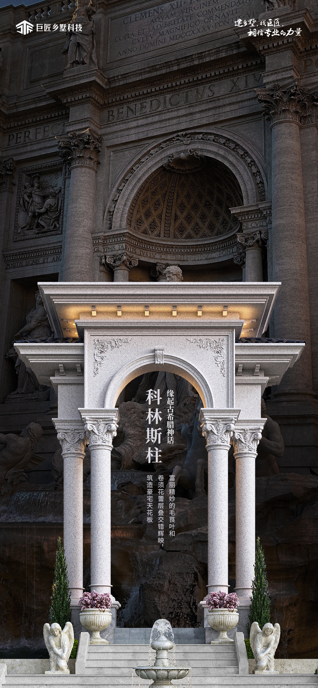 “三阶踏落,万物生辉”,每一步踏上石阶,仿佛都能听见《道德经》中“三生万物”的深邃哲思在耳边回响,寓意着家族传承如长河奔涌,生生不息。抬眼望去,超7米挑高的门楼巍峨耸立,气势恢宏。四根复刻自古希腊宙斯神庙的科林斯柱,柱顶毛茛叶与卷须花蕾雕刻得惟妙惟肖,叶脉间仿佛流转着古老的时光,静静迎接归家的主人。源自古罗马的山花浮雕优雅地舒展在窗楣之上,为门楼增添了华丽与灵动。中央锁石,以精妙的力学设计,诠释着建筑之美,稳固如同哈布斯堡王朝的纹章,无声地彰显着家业的坚实与长久。